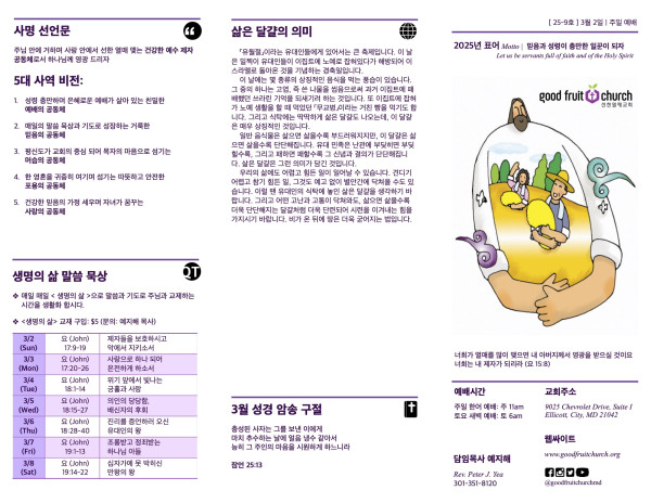 2025-03-02 페이지 정보 작성자 선한열매교회 댓글 0건 조회 2,324회 작성일 25-03-03 06:47 목록 본문 2025-03-02 이전글2025-03-09 25.03.10 다음글2025-02-23 25.02.25 댓글 0 댓글목록 등록된 댓글이 없습니다. 목록