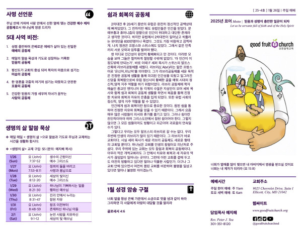 2025-01-26 페이지 정보 작성자 선한열매교회 댓글 0건 조회 3,350회 작성일 25-01-27 14:42 목록 본문 2025-01-26 이전글2025-02-02 25.02.03 다음글2025-01-19 25.01.19 댓글 0 댓글목록 등록된 댓글이 없습니다. 목록