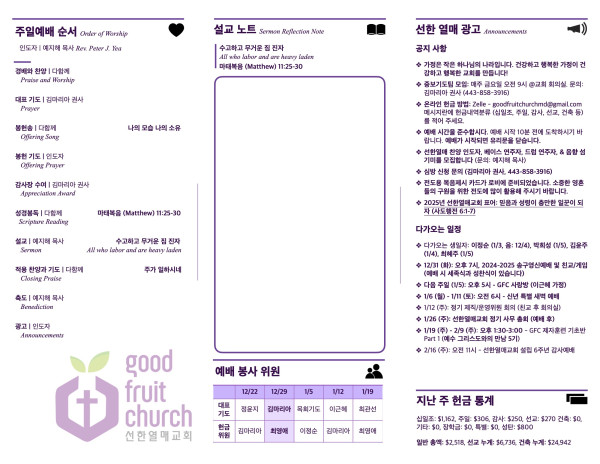 2024-12-29 페이지 정보 작성자 선한열매교회 댓글 0건 조회 4,408회 작성일 24-12-31 11:22 목록 본문 2024-12-29 이전글2025-01-05 25.01.07 다음글2024-12-22 24.12.23 댓글 0 댓글목록 등록된 댓글이 없습니다. 목록