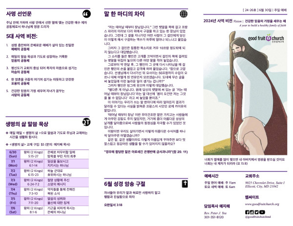 2024-06-30 페이지 정보 작성자 선한열매교회 댓글 0건 조회 4,299회 작성일 24-07-01 18:13 목록 본문 2024-06-30 이전글2024-07-07 24.07.08 다음글2024-06-23 24.06.24 댓글 0 댓글목록 등록된 댓글이 없습니다. 목록