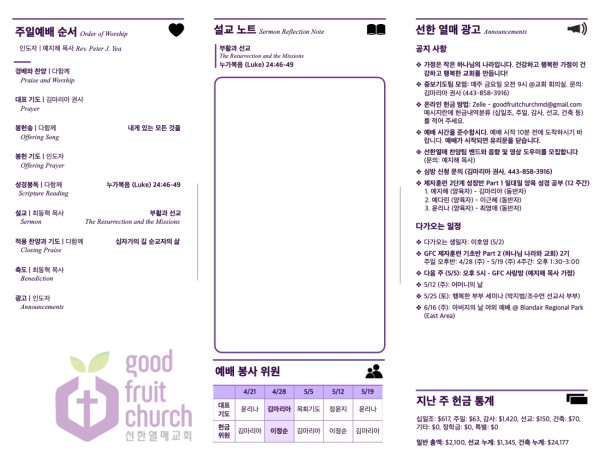 2024-04-28 페이지 정보 작성자 선한열매교회 댓글 0건 조회 4,567회 작성일 24-04-30 16:57 목록 본문 2024-04-28 이전글2024-05-05 24.05.08 다음글2024-04-21 24.04.22 댓글 0 댓글목록 등록된 댓글이 없습니다. 목록