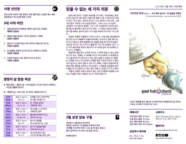 2023-03-19 페이지 정보 작성자 선한열매교회 댓글 0건 조회 6,298회 작성일 23-03-25 17:54 목록 본문 2023-03-19 이전글2023-03-26 23.03.25 다음글2023-03-12 23.03.25 댓글 0 댓글목록 등록된 댓글이 없습니다. 목록