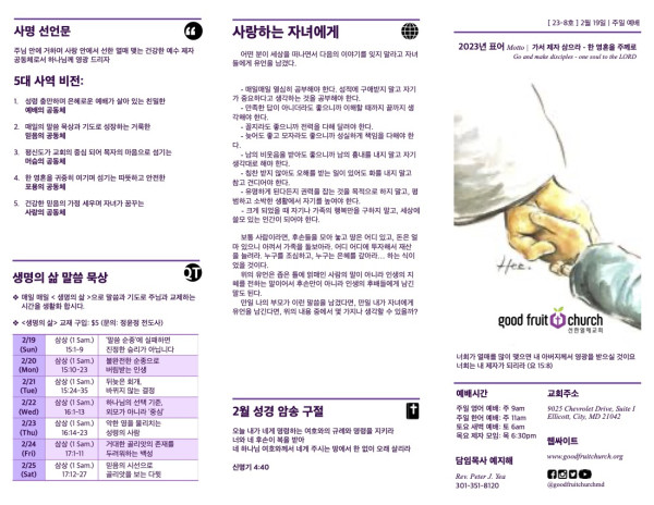 2023-02-19 페이지 정보 작성자 선한열매교회 댓글 0건 조회 6,268회 작성일 23-03-01 10:08 목록 본문 2023-02-19 이전글2023-02-26 23.03.01 다음글2023-02-12 23.03.01 댓글 0 댓글목록 등록된 댓글이 없습니다. 목록