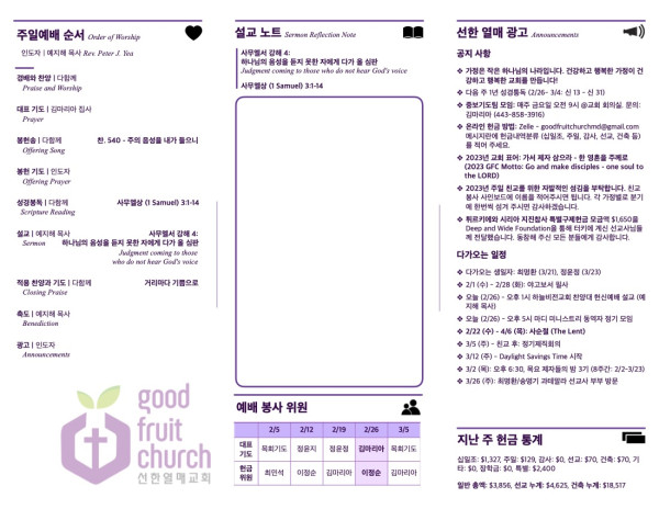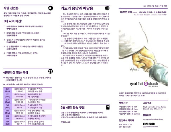 2023-02-26 페이지 정보 작성자 선한열매교회 댓글 0건 조회 4,964회 작성일 23-03-01 10:09 목록 본문 2023-02-26 이전글2023-03-05 23.03.10 다음글2023-02-19 23.03.01 댓글 0 댓글목록 등록된 댓글이 없습니다. 목록