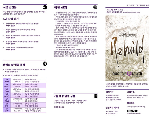 2022-07-03 페이지 정보 작성자 선한열매교회 댓글 0건 조회 6,723회 작성일 22-07-05 05:29 목록 본문 2022-07-03 이전글2022-07-10 22.07.16 다음글2022-06-26 22.06.27 댓글 0 댓글목록 등록된 댓글이 없습니다. 목록