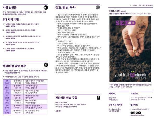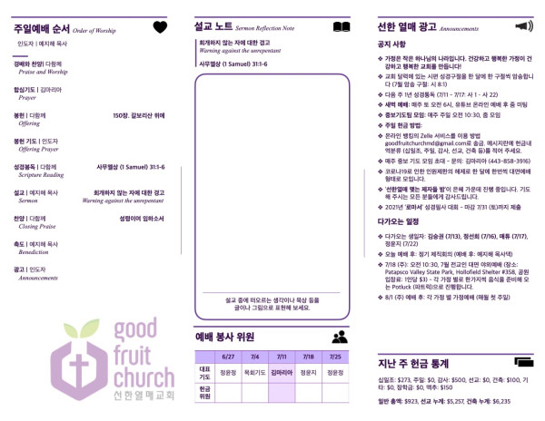 2021-07-11 페이지 정보 작성자 선한열매교회 댓글 0건 조회 11,128회 작성일 21-07-10 17:50 목록 본문 GFC 주일예배 주보 이전글2021-07-18 21.07.17 다음글2021-07-04 21.07.09 댓글 0 댓글목록 등록된 댓글이 없습니다. 목록