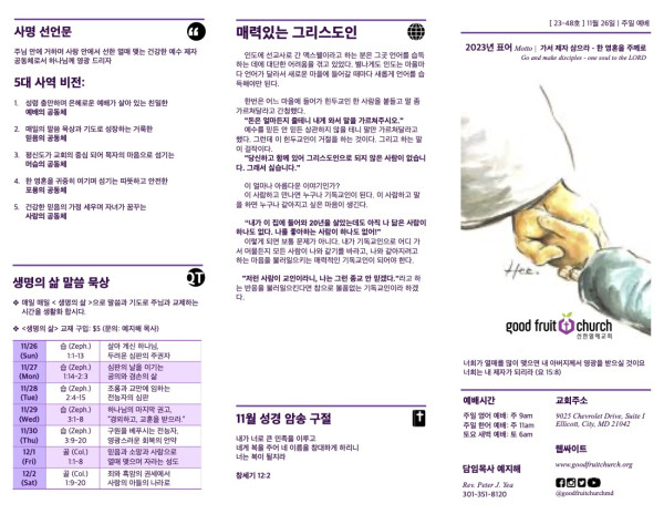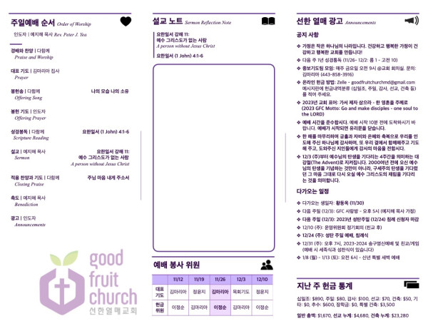 2023-11-26 페이지 정보 작성자 선한열매교회 댓글 0건 조회 5,852회 작성일 23-11-27 12:17 목록 본문 2023-11-26 이전글2023-12-03 23.12.03 다음글2023-11-19 23.11.19 댓글 0 댓글목록 등록된 댓글이 없습니다. 목록