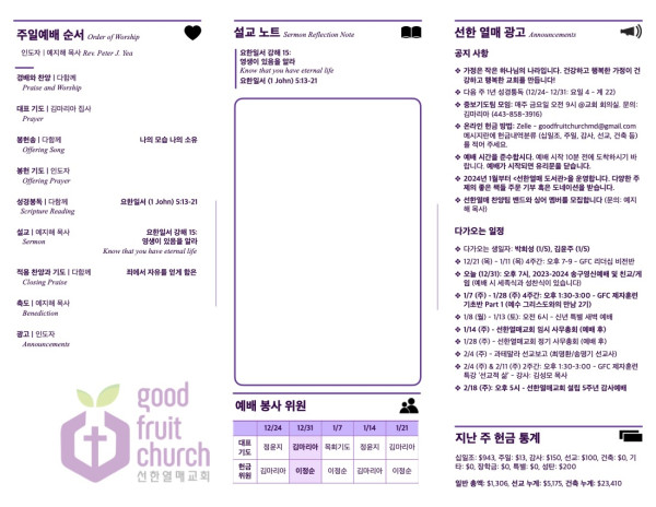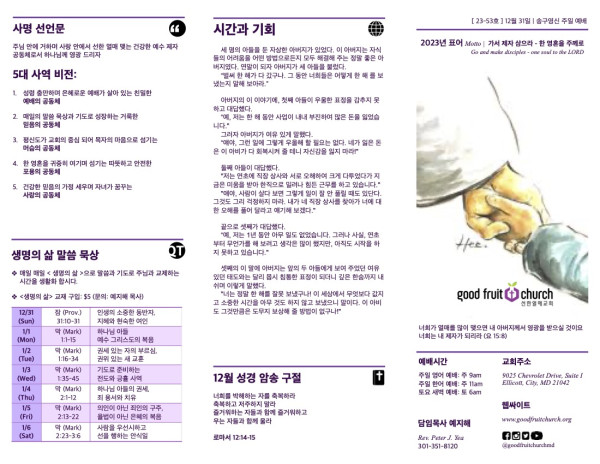2023-12-31 페이지 정보 작성자 선한열매교회 댓글 0건 조회 5,766회 작성일 24-01-02 09:08 목록 본문 2023-12-31 이전글2024-01-07 24.01.08 다음글2023-12-24 23.12.27 댓글 0 댓글목록 등록된 댓글이 없습니다. 목록